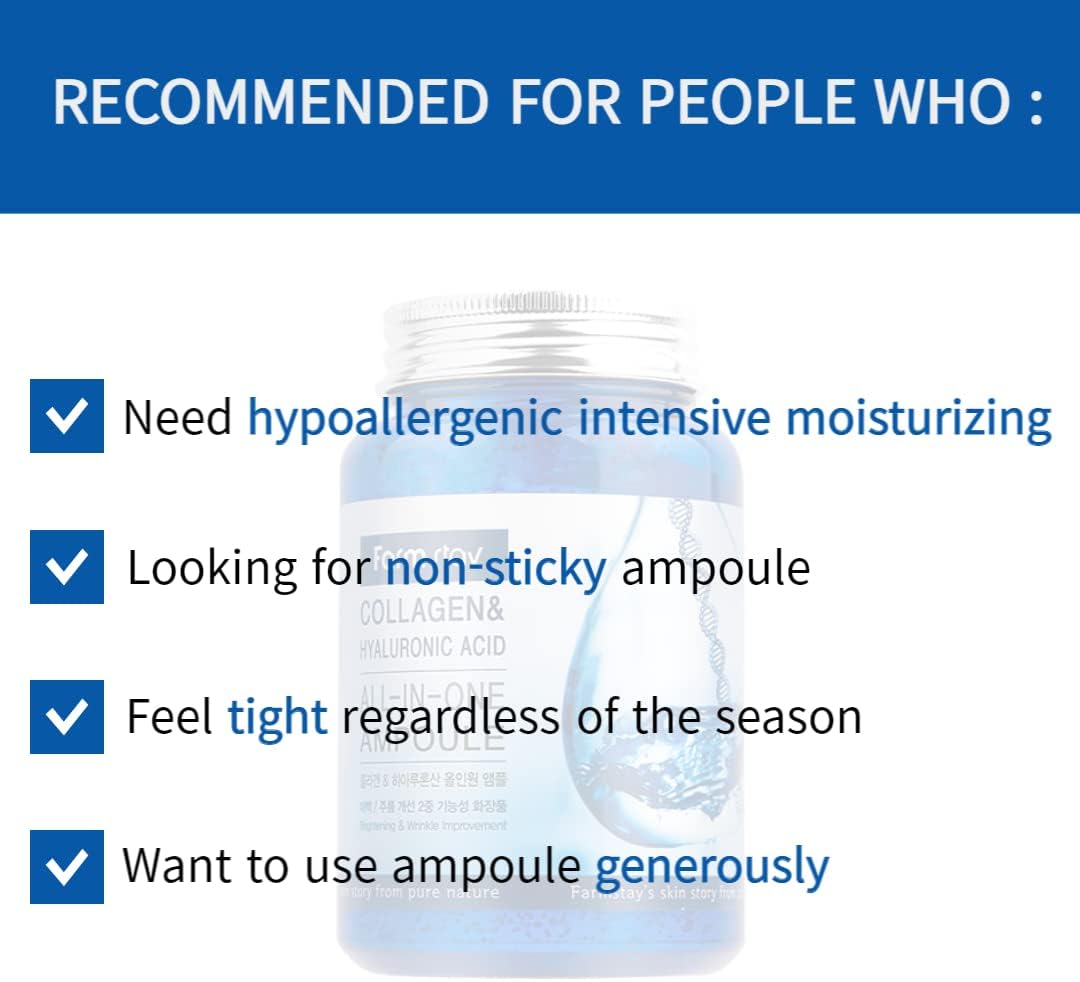 آمپول آل این وان فارم استی حاوی کلاژن و هیالورونیک اسید برای انواع پوست مناسب است. این مجصول با آبرسانی عمیق پوست سبب نرم و صاف و یکدست شدن آن می شود. این آمپول همچنین با افزایش کلاژن سازی به بهبود استحکام و انعطاف پذیری و خاصیت ارتجاعی پوست کمک می کند. آمپول کلاژن فارم استی برای آبرسانی زیر آرایش نیز قابل استفاده می باشد. این محصول پوست را روشن تر کرده و سلامتی پوست را به ارمغان می آورد.