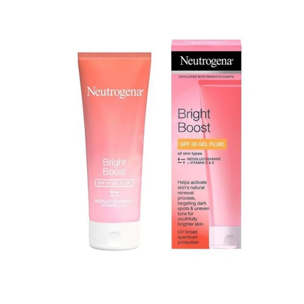 کرم ضد آفتاب SPF 30 برایت بوست نوتروژینا (Neutrogena Bright Boost Spf 30) محصولی از لاین برایت بوست برند Neutrogena میباشد. بافت این ضد آفتاب به صورت ژل فلوئید بسیار سبک است. به دلیل بافت سبک سریع جذب پوست شده و احساس سنگینی ایجاد نمیکند. کرم ضد آفتاب Bright Boost نوتروژینا حاوی ماده Neoglucosamine، ویتامین C و E میباشد. همچنین این کرم سرشار از مواد آنتی اکسیدان است که از پوست در برابر عوامل محیطی و رادیکالهای آزاد محافظت میکند.