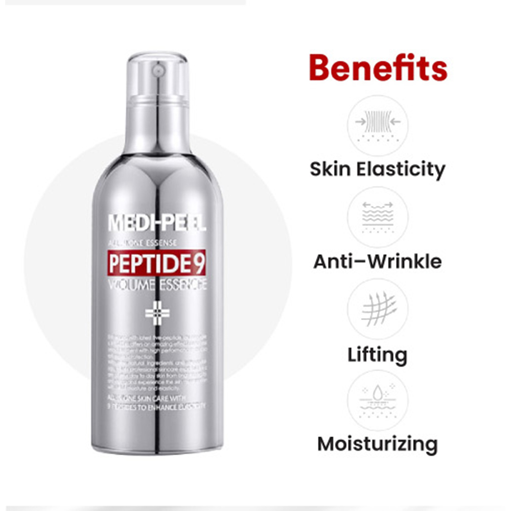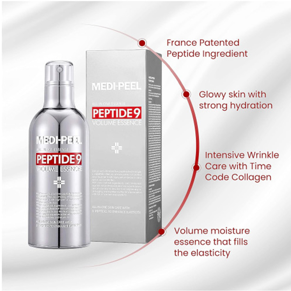 اسنس 9 پپتاید مدی پیل MEDI-PEEL Peptide 9 Volume All In One Essence یک محصول مراقبت از پوست است که حاوی 9 نوع پپتید مختلف، کلاژن، الاستین، هیالورونیک اسید و سایر مواد مغذی است. این اسانس برای بهبود خاصیت ارتجاعی پوست، کاهش چین و چروک، افزایش رطوبت و روشن شدن پوست طراحی شده است.