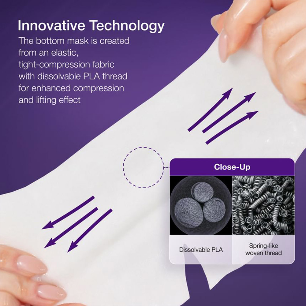 - ماسک پایینی با قابلیت لیفت پیشرفته: طراحی شده با شکافهای ارگونومیک برای قرارگیری محکم روی خط فک و گردن و حاوی رشتههای اسید پلی لاکتیک (PLA) که به طور موثری به زاویهسازی و لیفت این نواحی کمک میکنند.
