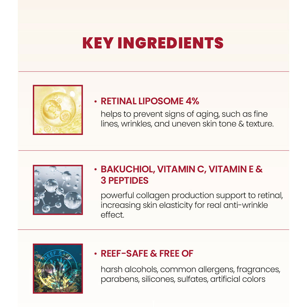 - رتینال لیپوزوم 4%: رتینال یکی از مشتقات ویتامین A است که به دلیل توانایی آن در تسریع گردش سلولی، تحریک تولید کلاژن و الاستین و کاهش ظاهر چین و چروکها شناخته شده است. استفاده از لیپوزوم به جذب بهتر و کاهش تحریک احتمالی پوست کمک میکند. این ماده به کاهش خطوط ریز، چین و چروک و بهبود بافت و رنگ ناهموار پوست کمک میکند.