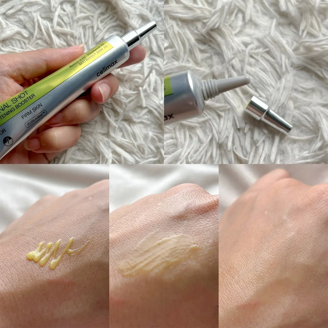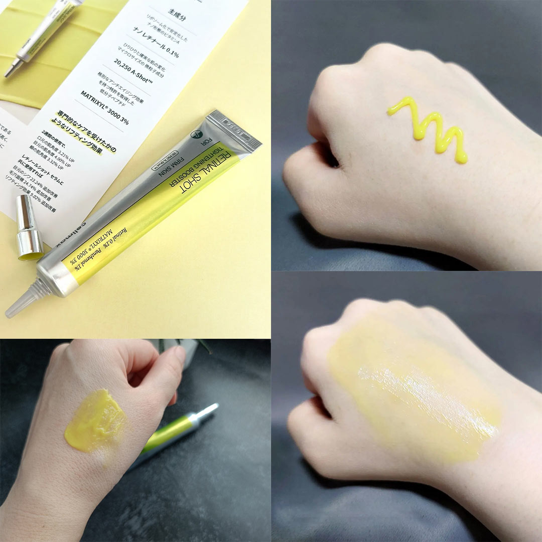 بافت غلیظ و زرد رنگ: این بوستر دارای بافتی غلیظ، مغذی و معمولاً زرد رنگ (به دلیل وجود رتینال) است که به راحتی جذب پوست میشود و احساس چربی ناخوشایند بر جای نمیگذارد.