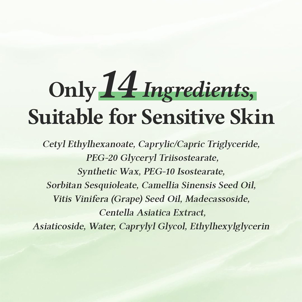در صدر این مواد، روغن دانه کاملیا قرار دارد که به خاطر خواص پاک کنندگی ملایم خود شناخته میشود و بهطور مؤثر ناخالصی ها را بدون از بین بردن رطوبت طبیعی پوست حذف میکند. این روغن سرشار از آنتی اکسیدان ها است که به تغذیه پوست و محافظت در برابر عوامل استرس زای محیطی کمک میکند. همچنین، روغن هسته انگور با بافت سبک خود به عمق پوست نفوذ کرده و آرایش، ضد آفتاب و سبوم اضافی را حل میکند و پوست را تمیز و هیدراته مینماید. این بالم حاوی مادکاسوساید و عصاره سنتلا آسیاتیکا است. این مواد به خاطر خواص تسکین دهنده و درمانی خود شناخته میشوند و برای تسکین و التهاب پوست ایده آل هستند.