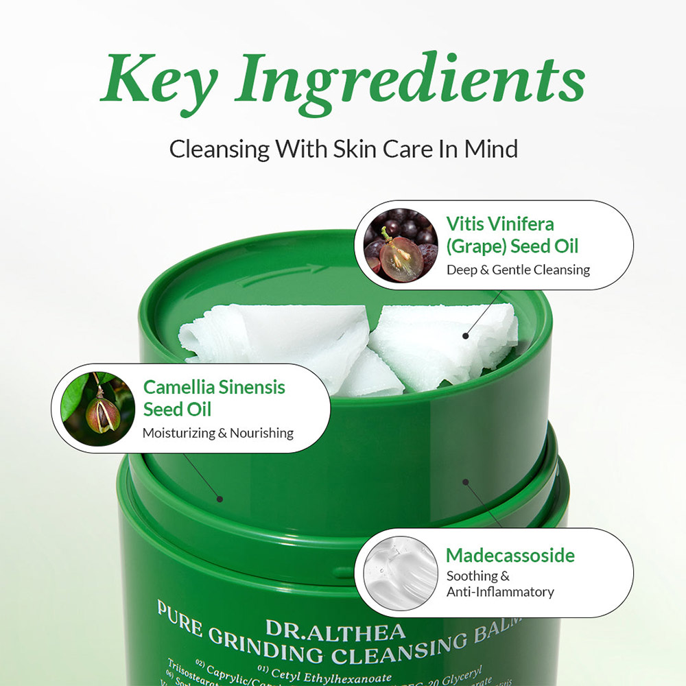 بالم پاک کننده Pure Grinding از برند Dr. Althea یک بالم پاک کننده کره ای است که به طور مؤثر آرایش، ضد آفتاب و آلودگی های روزانه را از پوست پاک میکند. فرمولاسیون این محصول شامل ۱۴ ماده است که هر کدام برای فواید خاص خود برای پوست برگزیده شده اند.