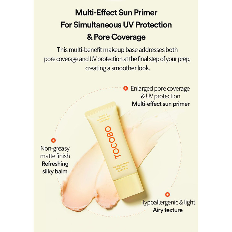 ضد آفتاب ویتا پرایمر توکوبو یک محصول چند منظوره است که در کنار مزایای پرایمر، محافظت کاملی در برابر اشعههای مضر UVA و UVB با SPF50+ فراهم میسازد. این برای محو کردن منافذ، حتی بافت پوست و ایجاد یک پایه صاف برای آرایش طراحی شده است. فرمول این محصول سبک، ضد آب است و شامل موادی مانند اسید مادکاسیک و آسیاتیکوزید برای تسکین و تقویت سد پوستی است. همچنین به عنوان یک پرایمر شیمیایی وگان خورشید توصیف می شود.