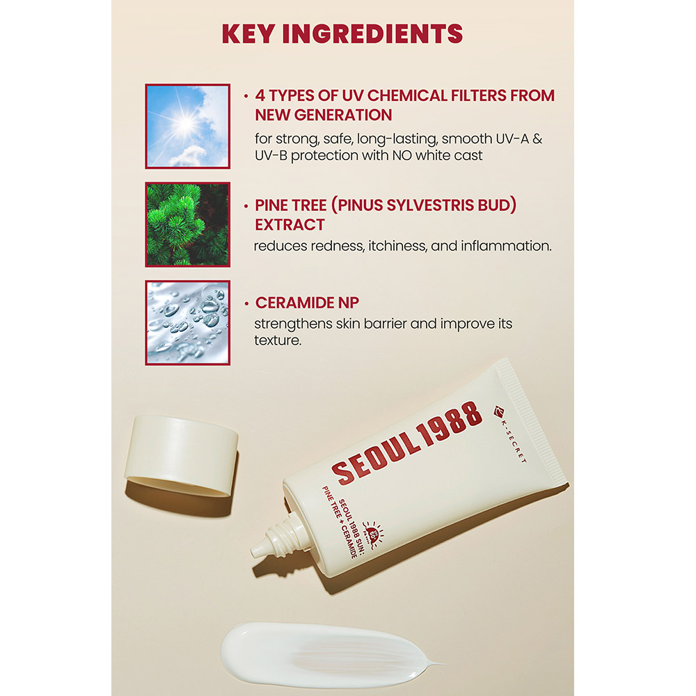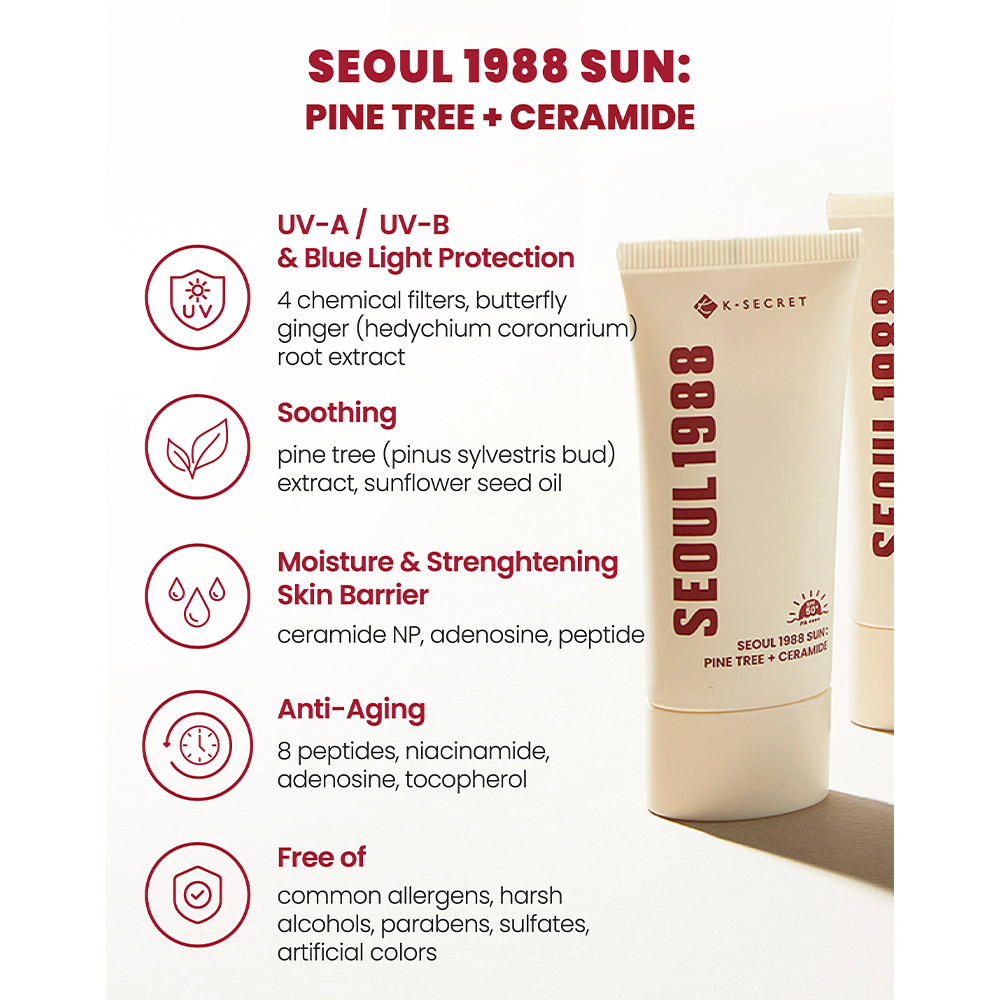 ضد آفتاب سئول 1988 کی سکرت “Seoul 1988 Sun : Pine Tree + Ceramide” از برند کرهای کی سکرت KSECRET یک محصول مراقبت از پوست است که با تمرکز بر محافظت قوی در برابر آفتاب و در عین حال تقویت سد دفاعی پوست، طراحی شده است. این ضد آفتاب با SPF 50+ و PA++++، بالاترین سطح محافظت در برابر اشعههای UVA و UVB را ارائه میدهد و در عین حال با ترکیبات مغذی خود، به سلامت کلی پوست کمک میکند.
