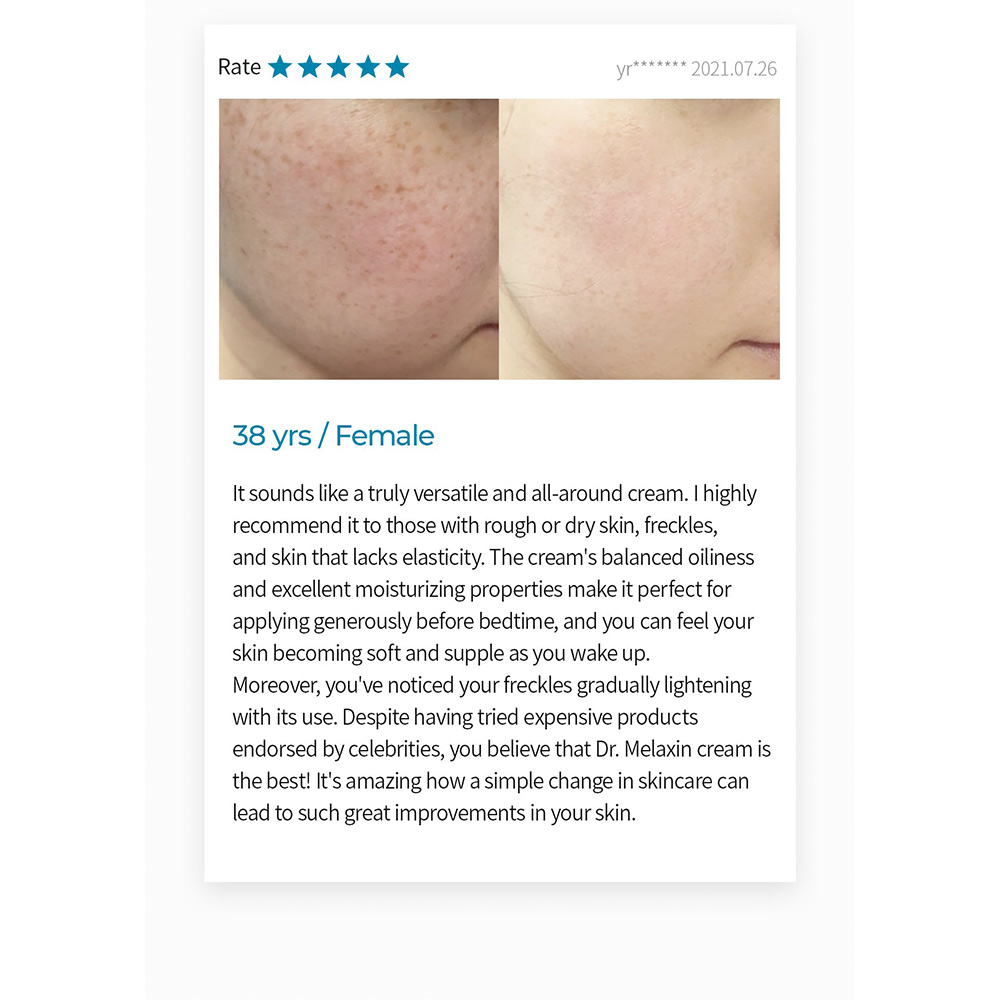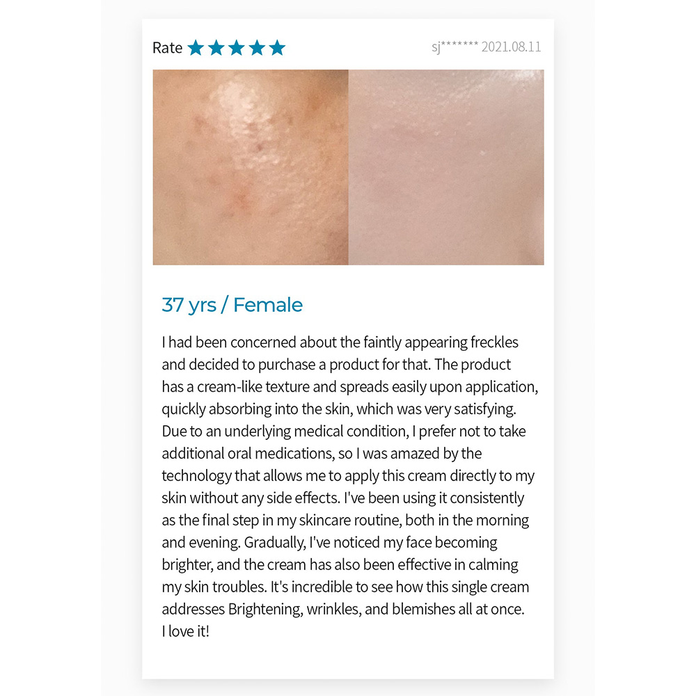 این کرم با الهام از درمان های لیزری و نتایج پژوهش های بالینی، به کاهش تولید بیش از حد ملانین کمک میکند و رنگ پوست را به مرور یکنواخت، روشن و شفاف میسازد.