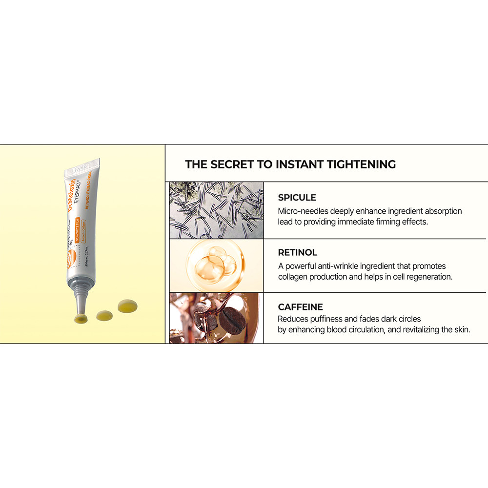 - رتینول: ترکیب اصلی جوان ساز پوست که با تحریک بازسازی سلولی، به کاهش خطوط ریز و چروک ها کمک میکند. رتینول باعث افزایش تولید کلاژن و الاستین در پوست ناحیه چشم شده و استحکام بافتی آن را بهبود میبخشد.