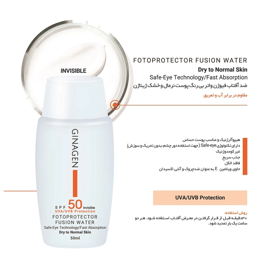 محافظت از پوست در برابر اشعه های مضر نور خورشید لازم و ضروری است و موجب پیشگیری از آفتاب سوختگی، پیری زودرس پوست و حفظ جوانی آن می شود. مهم ترین قدم در حفظ سلامت پوست مصرف کرم های ضد آفتاب مرغوب و با کیفیت است. شرکت کیمیا ژن ایرسا کرم ضد آفتاب بیرنگ پوست خشک ژیناژن را با کیفیت بالا و قیمت مقرون به صرفه تولید کرده است. این فرآورده دارای SPF 50 است و برای مصرف روی پوست خشک و معمولی مناسب می باشد.
