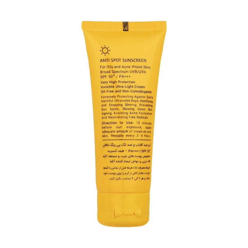 کرم ضد آفتاب بی رنگ لافارر مناسب پوست های چرب و مختلط و مستعد با +SPF50، دارای فیلترهای حفاظتی بسیار قوی می باشد که از پوست در برابر اشعه های UVA و UVB محافظت می کند. این کرم ضد آفتاب مخصوص پوست های چرب و مستعد آکنه حاوی عصاره گیاهان شیرین بیان، بیربری، سارمنتوزا ساکسی فراگا، آلوئه ورا و پاپایا میباشد که موجب پیشگیری و رفع لک های پوستی، مهار ترشح سبوم و مات کنندگی پوست، ضد حساسیت، کند کردن روند پیری پوست، جلوگیری از ایجاد آکنه و حفاظت بالا از پوست در برابر اشعه های UVA و UVB میشود.