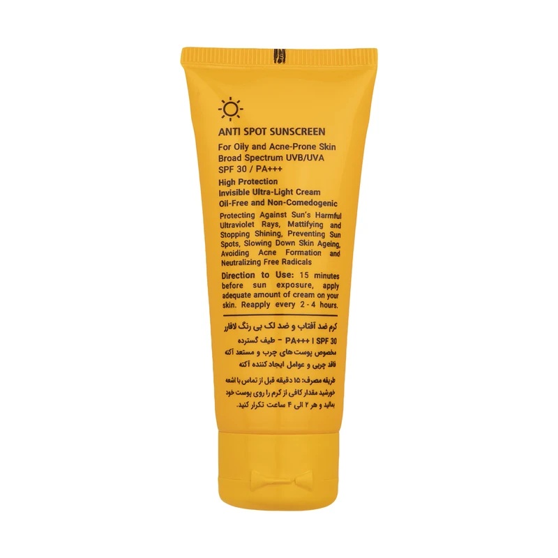 کرم ضد آفتاب بی رنگ لافارر مناسب پوست های چرب و مختلط و مستعد با +SPF30، دارای فیلترهای حفاظتی بسیار قوی می باشد که از پوست در برابر اشعه های UVA و UVB محافظت می کند. این کرم ضد آفتاب مخصوص پوست های چرب و مستعد آکنه حاوی عصاره گیاهان شیرین بیان، بیربری، سارمنتوزا ساکسی فراگا، آلوئه ورا و پاپایا میباشد که موجب پیشگیری و رفع لک های پوستی، مهار ترشح سبوم و مات کنندگی پوست، ضد حساسیت، کند کردن روند پیری پوست، جلوگیری از ایجاد آکنه و حفاظت بالا از پوست در برابر اشعه های UVA و UVB میشود.